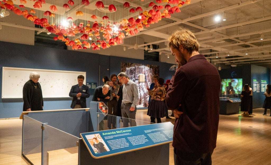 En visitant le musée, vous arriverez à l’œuvre délicate et immersive d’Amanda McCavour, un jardin composé de 500 coquelicots brodés et suspendus. L’artiste a transformé la galerie en un écosystème restauré grâce à des fils et des couleurs éclatantes. Inspirée par la mousse et le lichen, l’œuvre de Natasha Lavdosky brouille la frontière entre l’art et la science. Elle nous invite à voir la renaturation comme une alliance avec des organismes vivants souvent négligés, qui permettent de relier les écosystèmes entre eux. Les œuvres d’Amber Sandy en écorce de bouleau et en cuir honorent les savoirs des peuples autochtones et leurs relations avec le territoire, contribuant à la renaturation des liens culturels et écologiques.