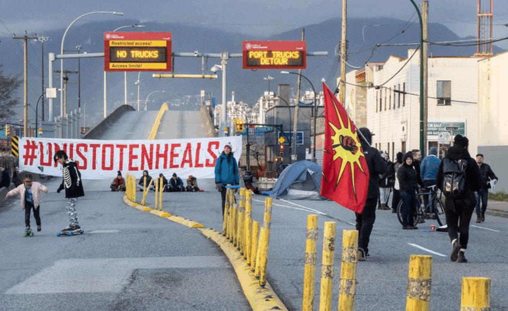 Manifestation à l'entrée du port de Vancouver en 2020 en soutien aux défenseur.e.s des terres Wet'suwet'en. Les défenseur.e.s des terres et des droits autochtones ont été parmi les opposant.e.s les plus engagé.e.s face à ces initiatives de déréglementation. (Photo : Sally T. Buck via Flickr)
