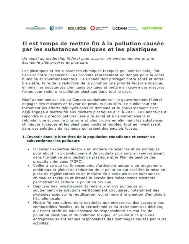 L’Association canadienne des médecins pour l’environnement, la Fondation David Suzuki, Ecojustice, Environmental Defence, Oceana et Greenpeace lancent un appel au leadership fédéral pour assurer un environnement et une économie plus propres et plus sûrs en mettant fin à la pollution causée par les substances toxiques et les plastiques.