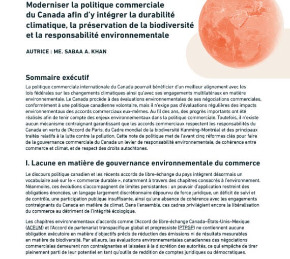 Biodiversité 17 novembre 2025 Moderniser la politique commerciale du Canada afin d’y intégrer la durabilité climatique, la préservation de la biodiversité et la responsabilité environnementale Lire la suite